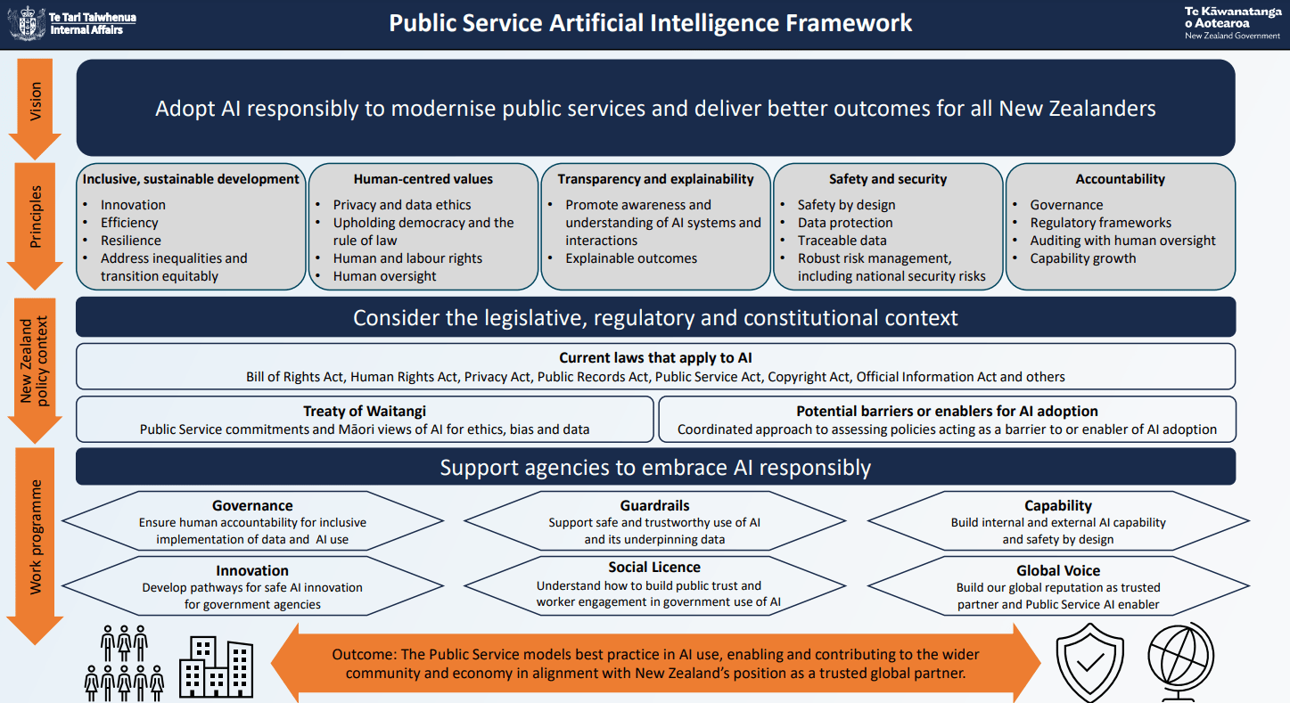 - Light-touch rules: Use existing laws (Privacy Act, Human Rights Act) rather than creating new AI-specific laws.
