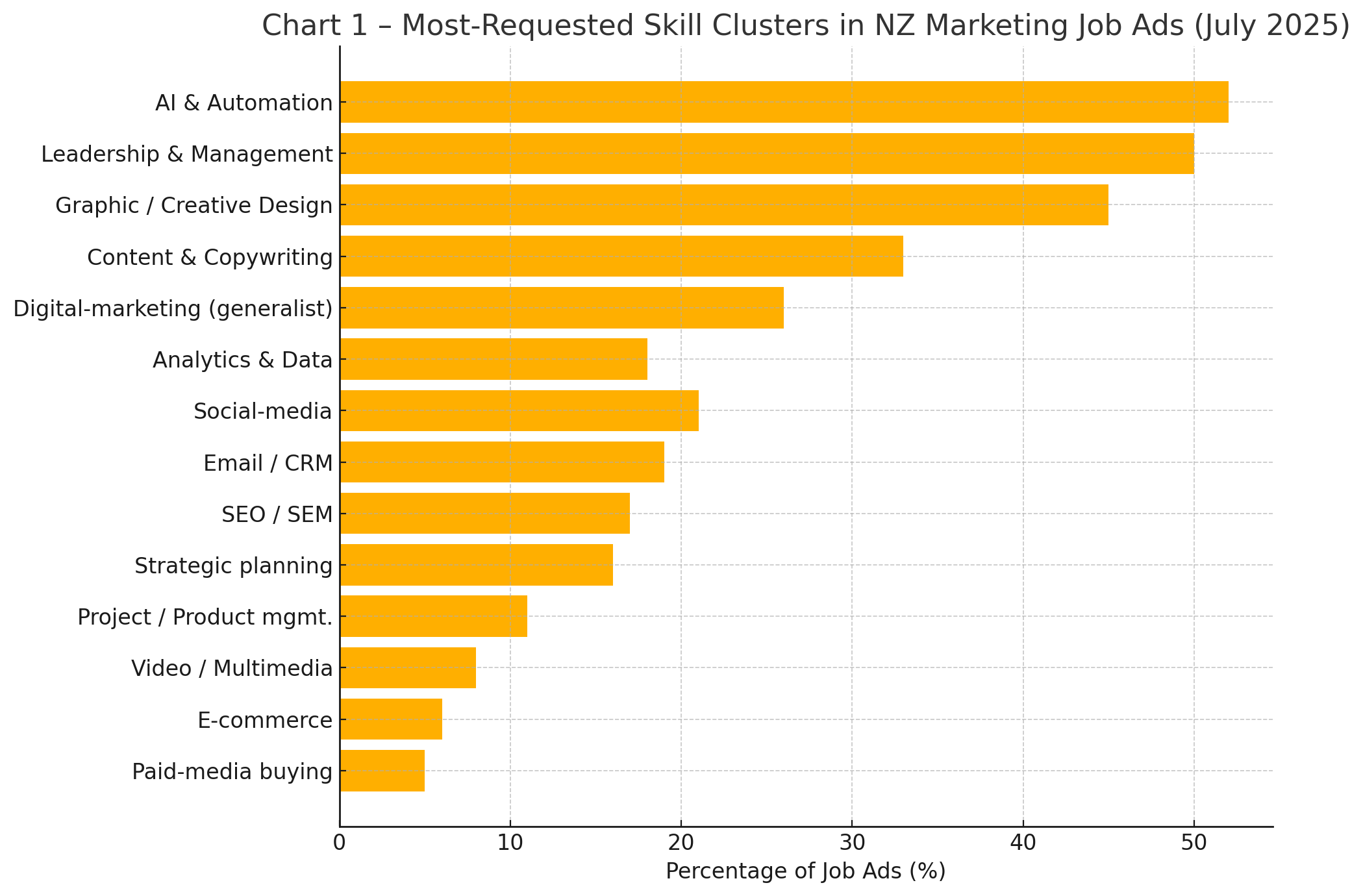 And today's NZ employers expect intermediate marketers to have AI & Automation skills, based on our research into current employment advertising for marketing roles: