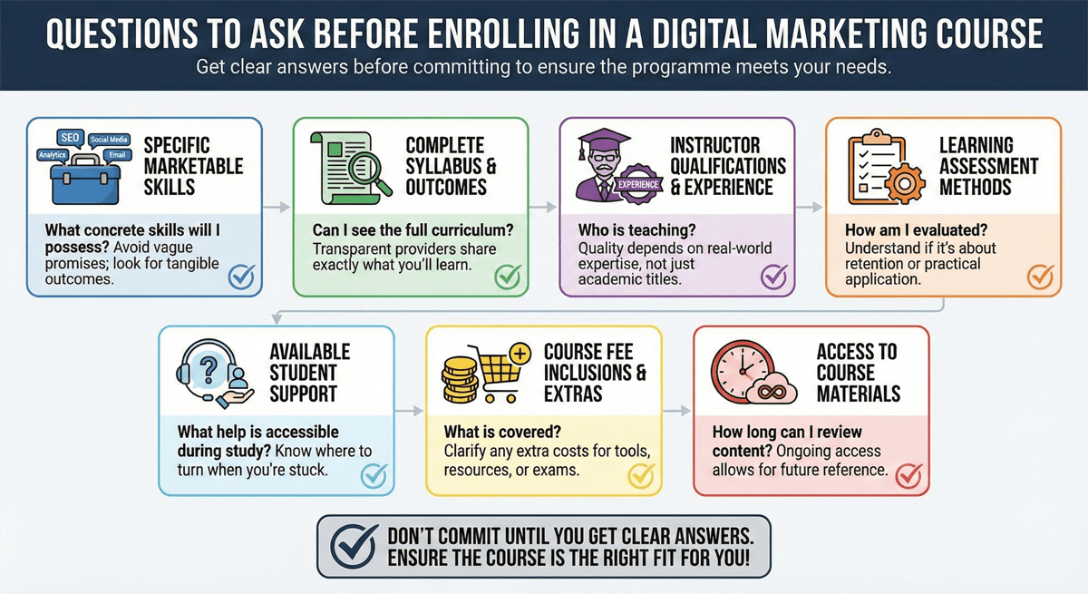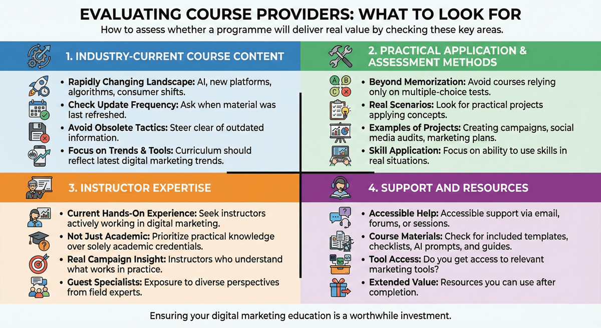 Digital marketing changes rapidly. AI in marketing, new platforms, algorithm updates, and shifting consumer behaviours mean courses must stay current. Ask when the course material was last updated.