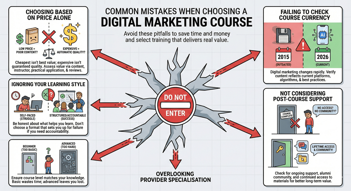 Don't get paralysed trying to find the "perfect" course. Focus on finding one that covers fundamentals comprehensively, offers flexibility that fits your schedule, comes from instructors with real marketing experience, and emphasises practical application over pure theory.
