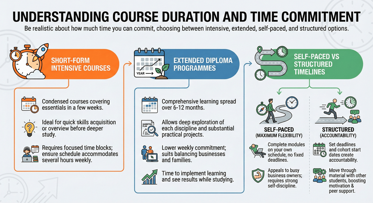 Course duration varies significantly based on qualification level and format. Certificate programmes typically take 2-4 months of part-time study, whilst diploma qualifications usually require 6-12 months. Intensive short courses might condense essentials into just a few weeks, whilst self-paced online programmes let you control the timeline completely. Your available study time matters more than nominal course length—someone dedicating 10 hours weekly will progress faster than someone managing just 3 hours. Most providers give you flexibility to extend completion time if needed, though cohort-based programmes have more rigid schedules.
