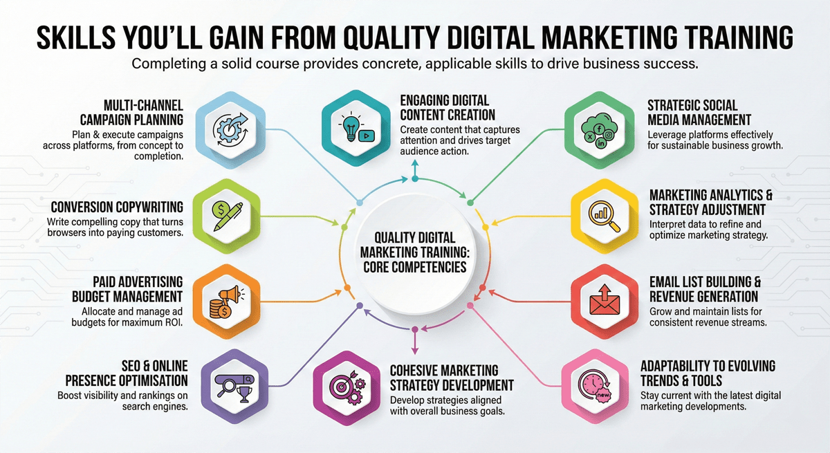 A comprehensive digital marketing course should equip you with a broad range of marketing skills. Here's what quality programmes typically include: