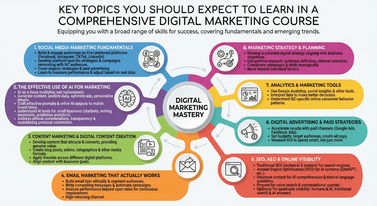 A solid course should cover the fundamentals of digital channels whilst also keeping pace with the latest digital technologies and marketing tools. You want training that reflects how New Zealanders actually engage with online content, not generic international examples that don't apply to our market.