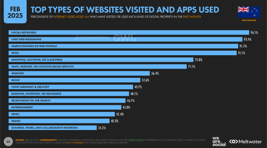Digital Behaviour Patterns Recent data shows New Zealanders spend significant time online, with particular engagement on, well, see for yourself:
