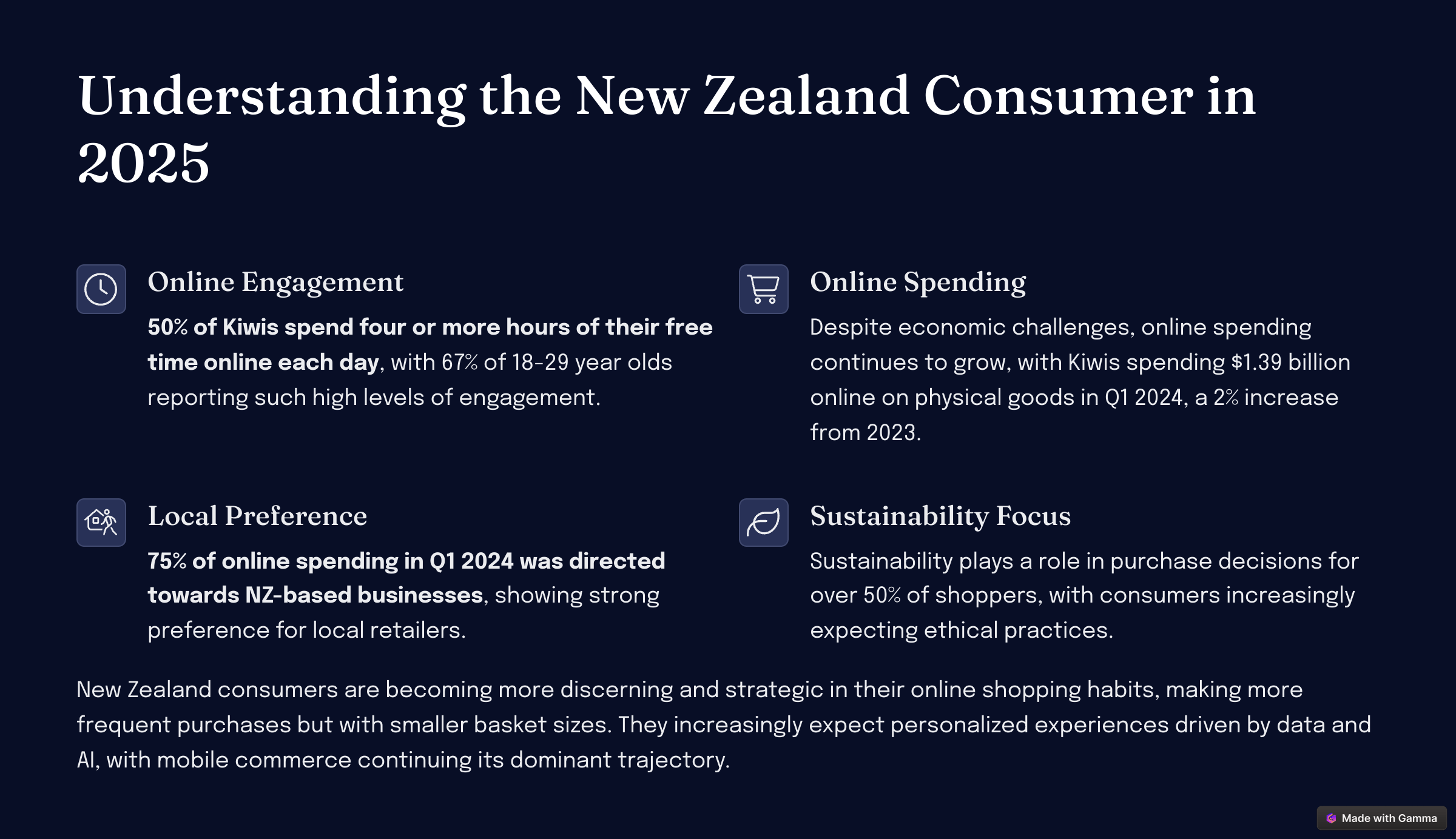 There is a strong preference for local retailers, with 75% of online spending in Q1 2024 directed towards NZ-based businesses [14]. Insights from Shippit also suggest that New Zealand consumers are prioritising value-driven purchases, saving up for significant items during sales events [15].